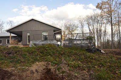 Yesterdy we focused on the west side of the house. Years ago we built "Hugel" hills that you see covered in black tarps in the above picture. These beds make excellent gardens for squash, and pumpkins.